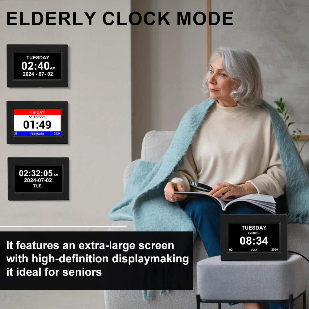 - 【Elderly Clock】: It features an extra-large high-definition screen . The time, date, and day of the week are shown in large, non-abbreviated, and【 easy-to-read font, making it ideal for seniors】. Additionally, it includes 8 icon-based alarm groups for activities such as taking medication, exercising, and waking up. When an alarm goes on, the corresponding icon is displayed to remind you of the current activity. it has a voice time announcement feature that announces the time every hour